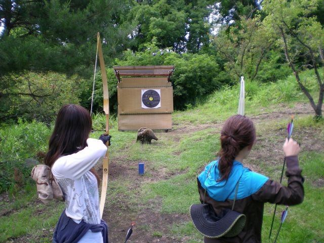まずはこちらの練習場で、実際に的に当てる練習をします。最初は近くから、慣れたら徐々に遠くに離れて射る練習をします。練習をしながら、前のグループがコースを進むのを待ちます。